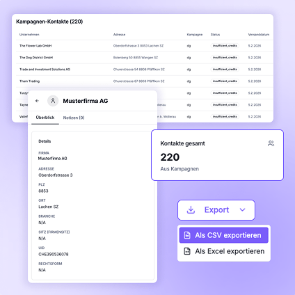 Sie erhalten die Kontaktinformationen (Firmenname, Adresse, Gründungsdatum) der angeschriebenen Firmen und können diese jederzeit als CSV exportieren – z.B. für CRM oder Reporting.