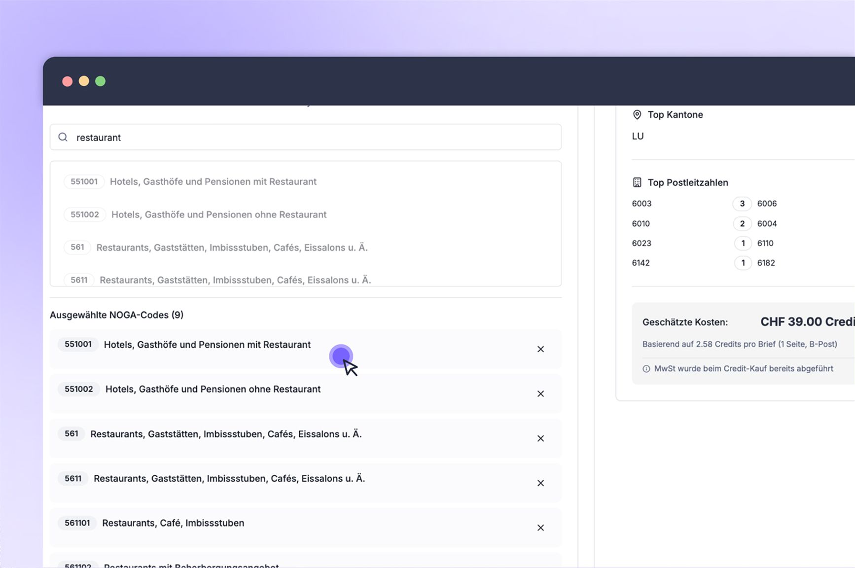 Definieren Sie Zielgruppen präzise nach Branche – bis auf NOGA-Code Ebene. So erreichen Sie nur jene Neugründungen, die wirklich zu Ihrem Angebot passen.